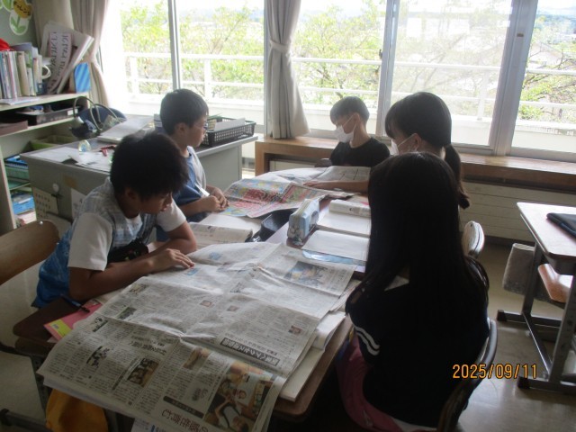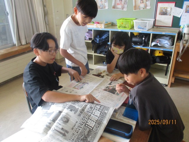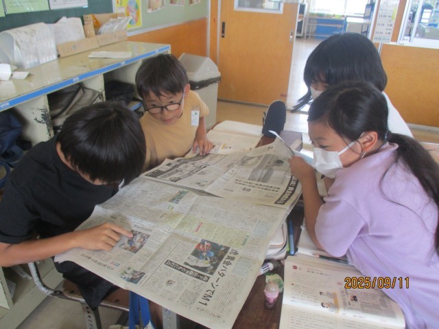 国語科「新聞を読もう」の学習です。新聞には、見出しやリード文、コラムなど様々な構成があることを学習しました。一面には、その日の重要なニュースが載っています。興味津々で見ていました。