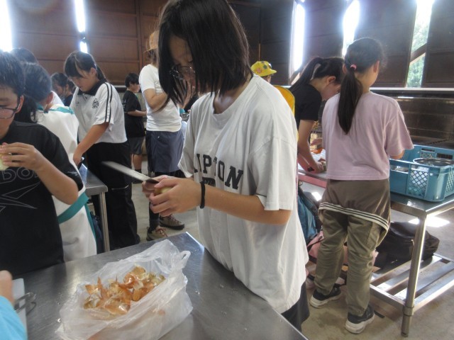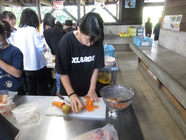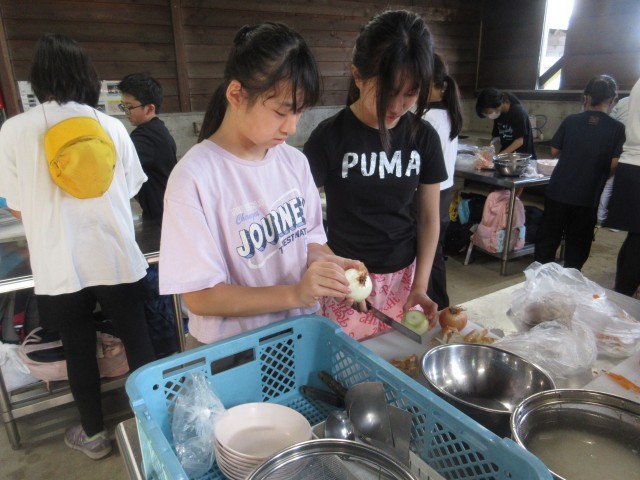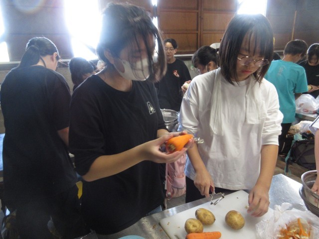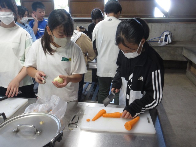 2日目は野外炊飯です。カレーライスづくりに取り組みました。竈チームと調理チームに分かれて、協力して進めていきます。