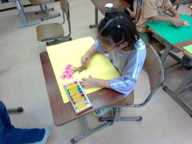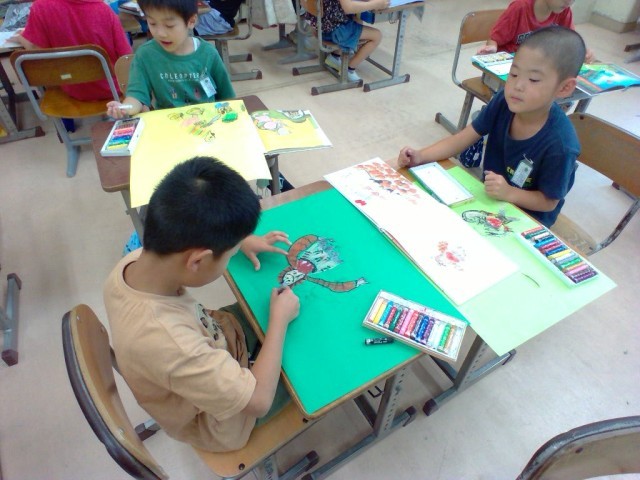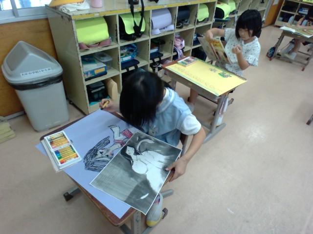 図画工作科では、昔話を読んで好きな場面や心に残った場面を絵にしました。想像したことを、色や形で自分らしく表現することができました。