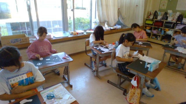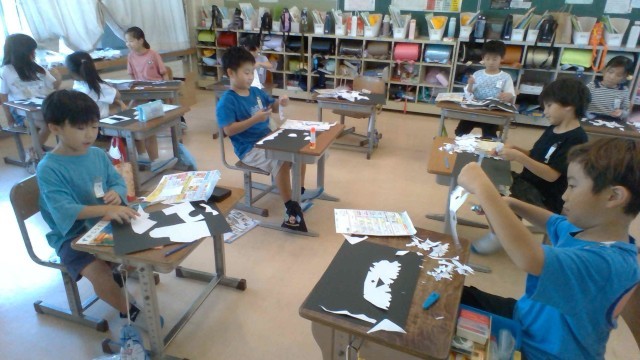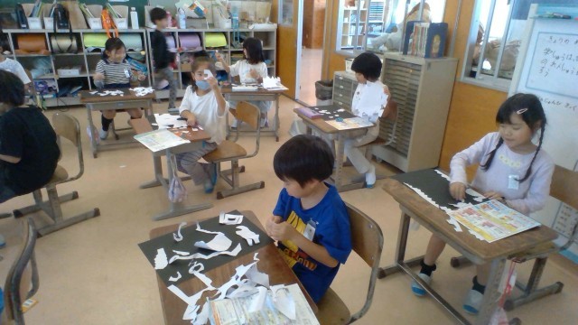 切ってできた大小の形を、黒画用紙に並べて、どんな様子に見えるか考えました。