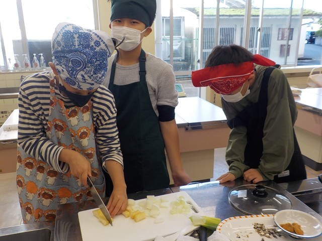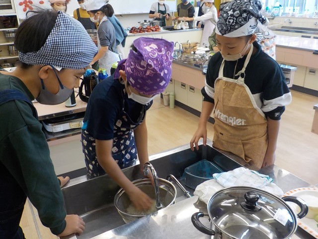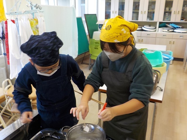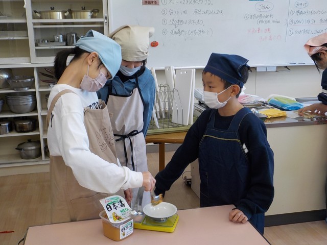 5年生は、調理実習でごはんとみそ汁を作りました。同じ班の友達と役割を分担したり声を掛け合ったりしながら、協力して作ることができました。