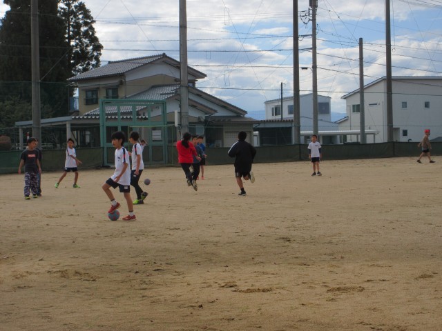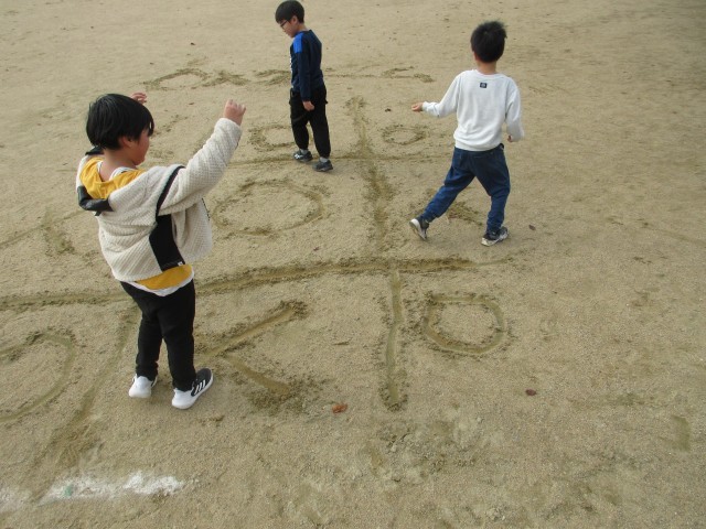 元気よく、サッカーをしたり、〇✕ゲームを地面に書いたりして楽しんでいました。