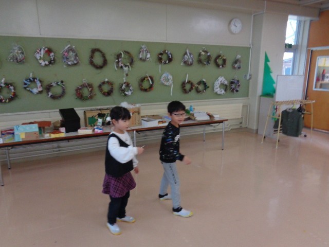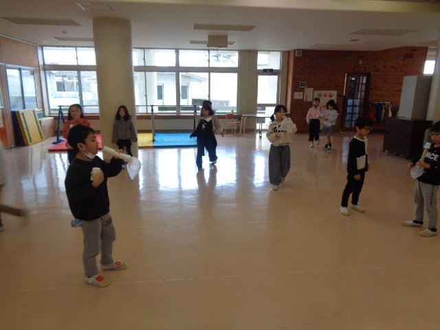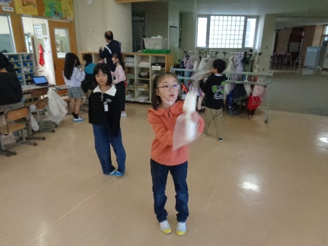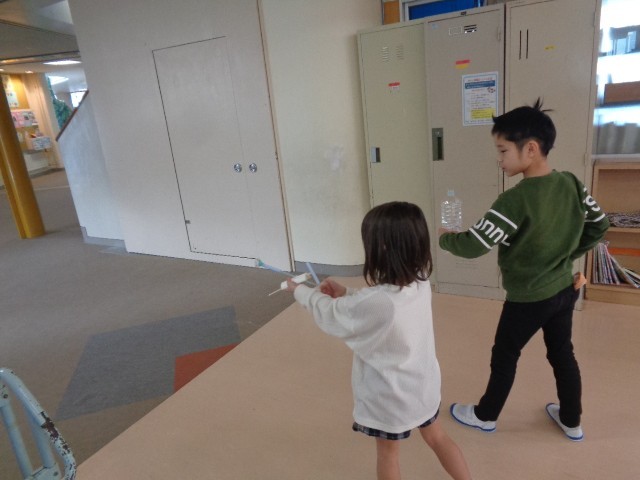 作ったおもちゃで遊びました。紙コップをとばしたり、ブーメランをしたりして皆で仲よく遊びました。友達が作ったおもちゃの遊び方を聞いて遊ばせてもらったり、自分でも作ってみたくなったりするなど、皆で仲良く遊ぶことができました。