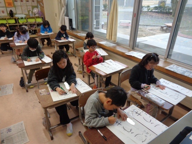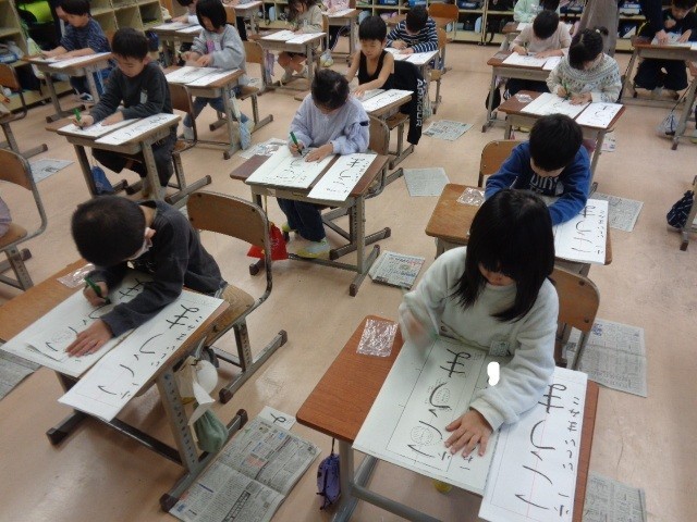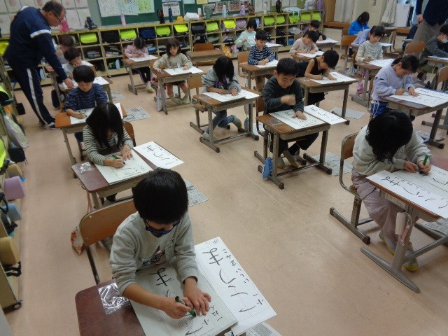 硬筆墨を使って「こうま」と書く練習をしました。手本をなぞったり、名前を丁寧に書いたりしました。最後に1枚手本を見ながらじっくり書きました。納得のいく文字が書けるようにもっと練習したいと話す子どもたちでした。