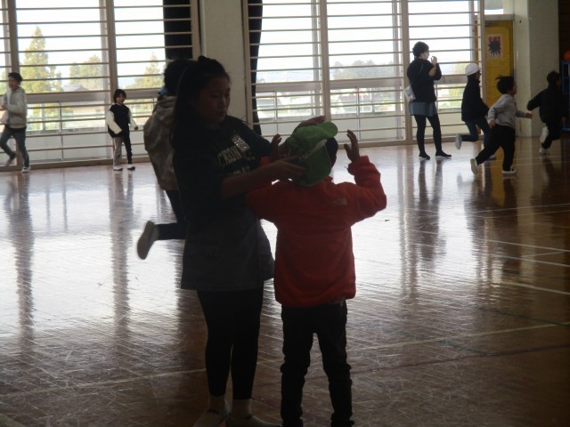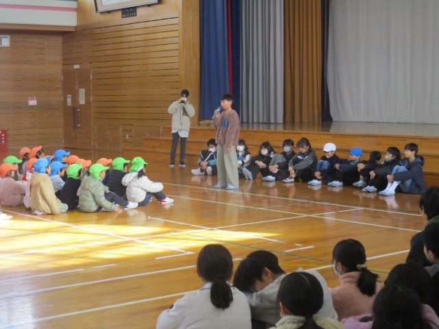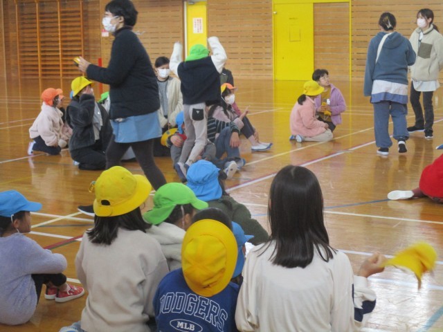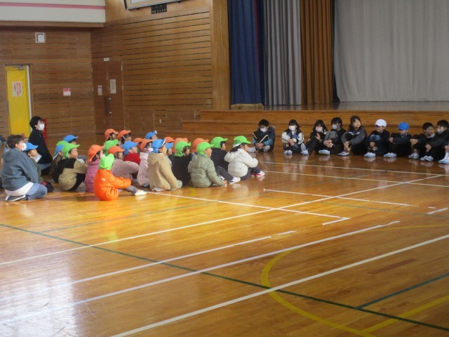 インフルエンザの流行で、4週間延期になっていましたが、みんなが楽しみにしていた第三回目の交流会がありました。今回の交流は集会で、おにごっこやクイズ等、園児が楽しんでくれるように、仲が深められるように考えました。