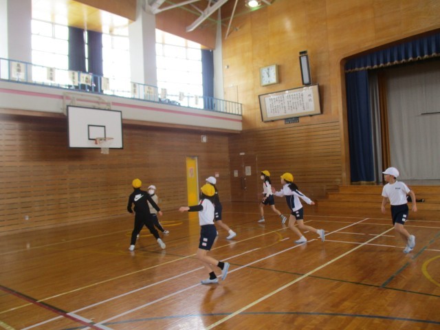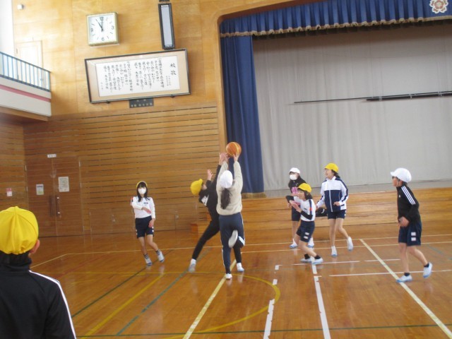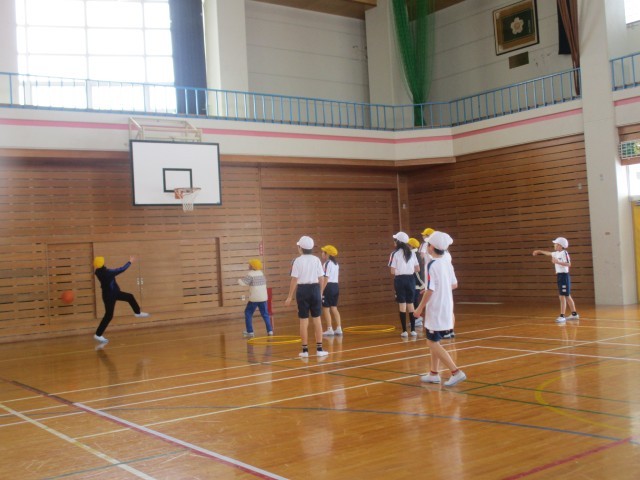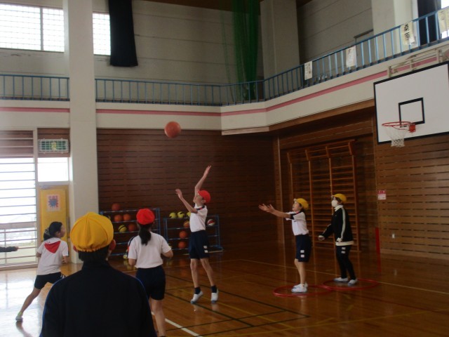 体育科ではシートバスケットボールをしています。ボールを持った時、どうパスをつなぐか、ボールを持っていないときはどう動いたらよいか考えながら練習します。
