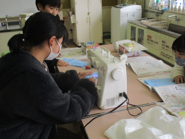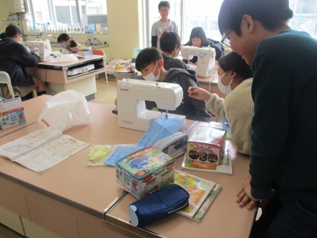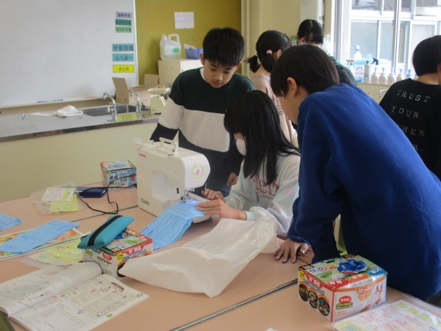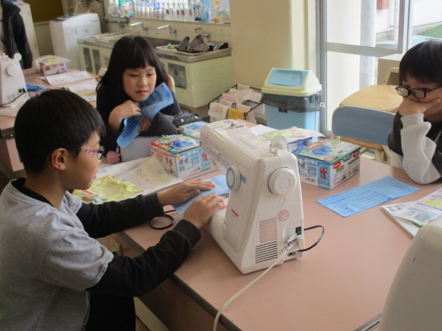 家庭科では、ミシンに挑戦中です。ミシンは未経験の子供たちが多いので、部分の名前や手順をしっかり確認し、練習しました。手縫いに比べて早く丈夫に縫えるミシンでの作品作りを、5年生は楽しみにしています。