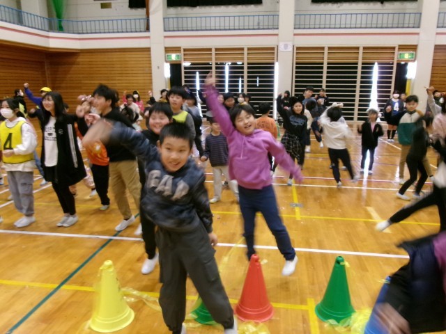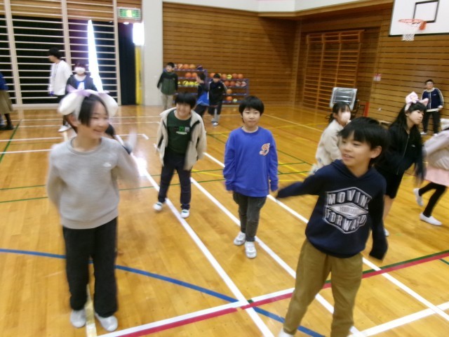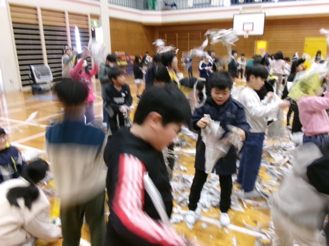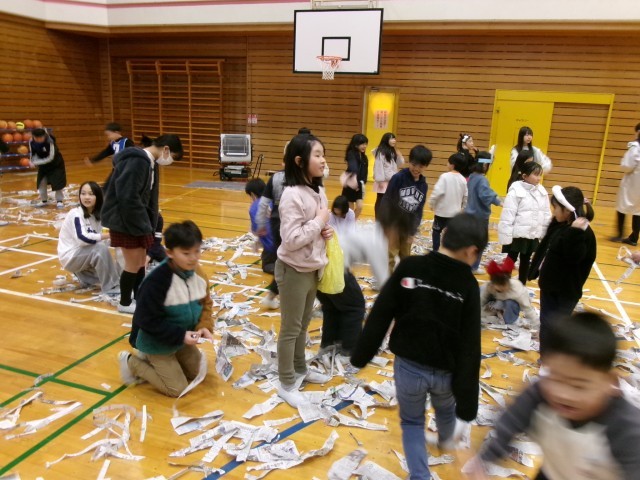保健委員会が「かぜに負けるな!寒さなんか吹き飛ばそう集会」を行いました。音楽に合わせて新聞をさいたり、ダンスをしたりするなど、心も体もあたたまる集会になりました。