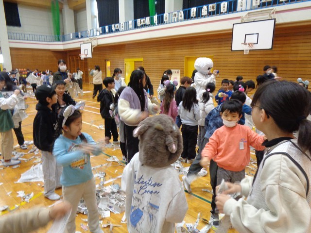 集会では、栄養教諭や養護教諭から、強い体をつくるために「なんでも食べること」「十分な睡眠をとること」「体を動かすこと」を学び、その実践として、ジャンボリーミッキーを全校で踊りました。