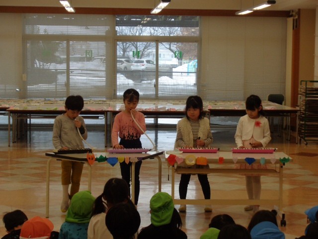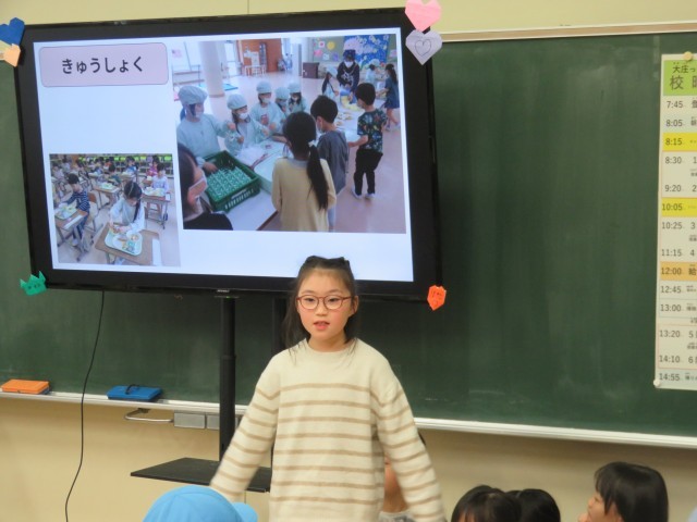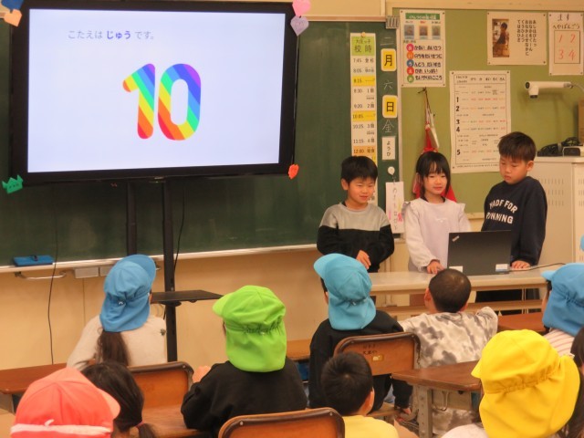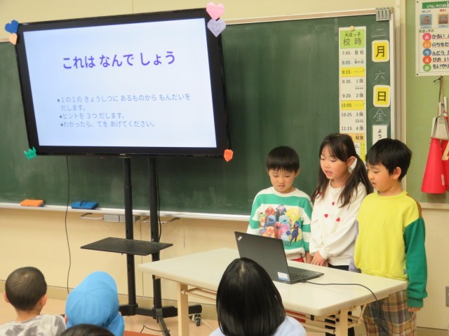 来年度入学の年長児との交流会を行いました。まず、教室で学校紹介をしたり、国語科や算数科、図画工作科の学習体験をしたりしました。年長児に分かりやすいように、大きな声で説明しました。ランチルームでは、鍵盤ハーモニカの演奏を披露したり、みんなでかもつれっしゃをして遊んだりしました。最後にはプレゼントを渡しました。終わってから、年長さんに「ありがとう」と言われて嬉しかった、緊張したけど大きな声で言えた等と話していました。小学校のお兄さんお姉さんとして、自分の役割に責任をもって頑張ることができました。