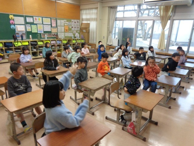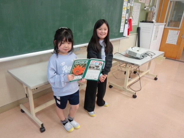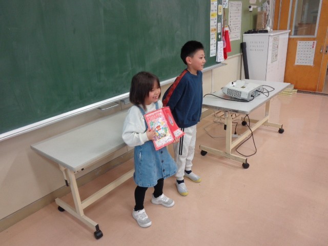 国語科では、学校にあるもののクイズを出し合いました。難しいヒントからだんだん分かりやすいヒントを出していき、最後はみんなが分かるように工夫しました。ペアで相談して、伝わりやすいヒントを考えることができました。