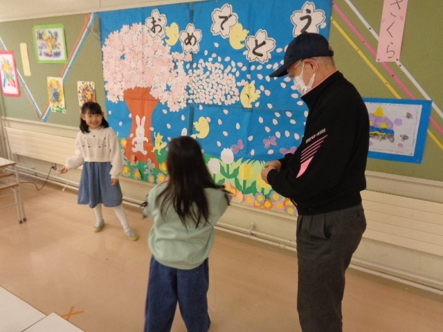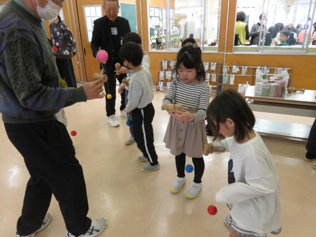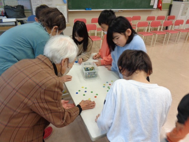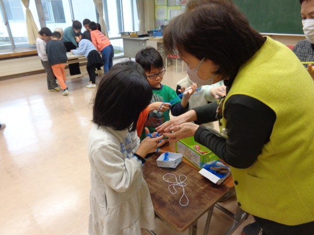 生活科では、昔の遊びの練習を積み重ねてきました。今日は、昔の遊び交流会を行い、地域の方にうまくいくコツや新しい技を教わりました。けん玉、こま、あやとり、お手玉、おはじきを教えていただきました。技ができるようになったり、たくさん褒めていただいたりして笑顔いっぱいの交流会となりました。もっと上手になりたい、練習したいとこれからの活動への意欲を高めました。