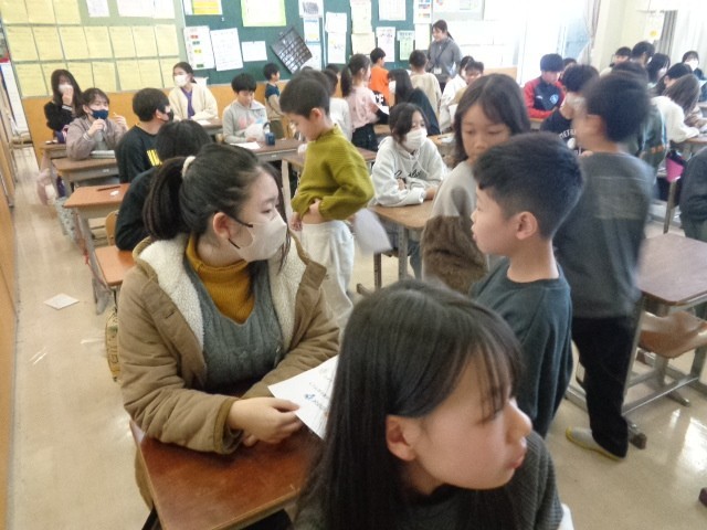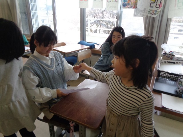 明日は6年生の卒業をお祝いする集会があります。1年生が書いた招待状を6年生に渡しに行きました。同じファミリー班の6年生に感謝の気持ちや、一緒に楽しみたい気持ちを伝えて渡しました。招待状を渡して、集会も楽しみになっていました。