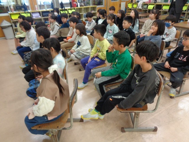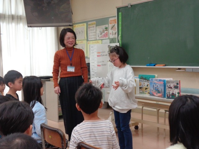 大山図書館から2名の方が学校に来て、読み聞かせや本の紹介をしてくださいました。最初に耳で楽しむ物語を聞きました。お話を全て覚えておられて、集中して言葉一つ一つを聞きました。その後は、学校生活に関する本を次々に紹介してくださいました。自分たちの生活と重ねながら聞くことができました。紹介してくださった本は1か月間、教室で読むことができます。気になって早速読んでいる子どもの姿も見られました。これからもたくさん本を読みたいと話していました。