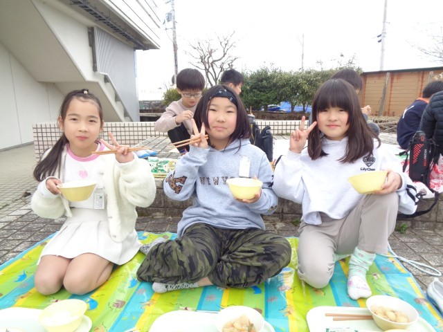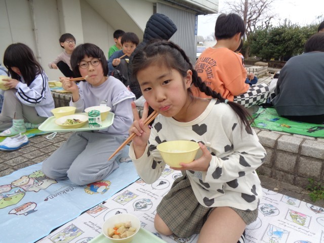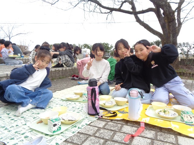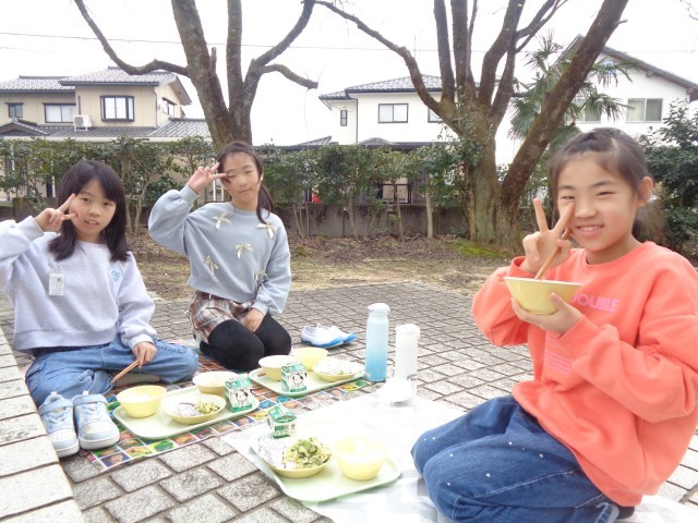 4月に外で食べたときは桜が咲いていて、お花見給食でしたが、今回はふくらんだ芽に春を感じました。