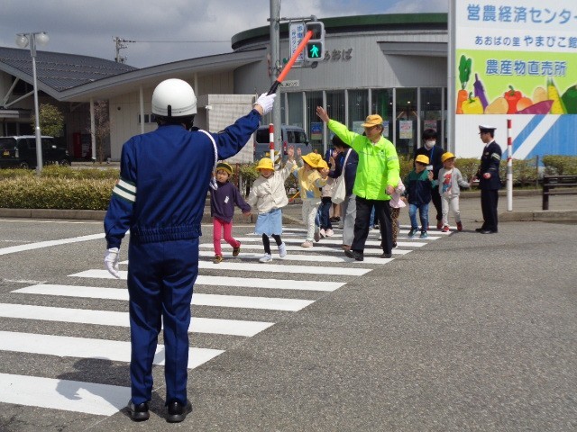 警察や交通安全指導員の方々と一緒に、交通安全教室をしました。