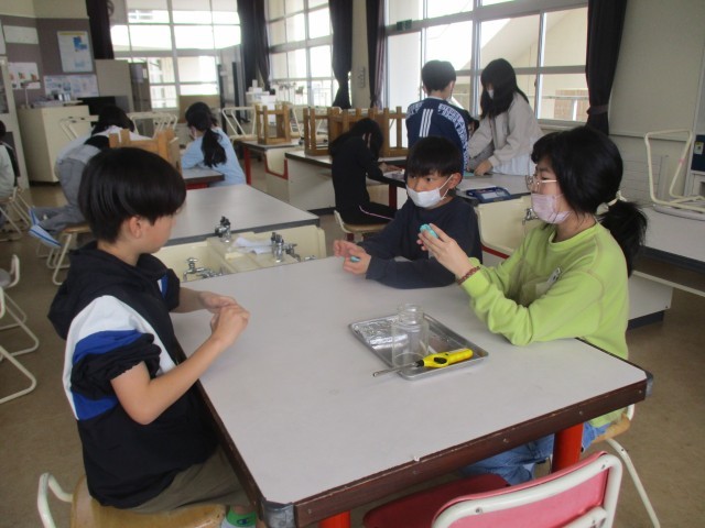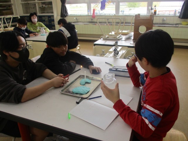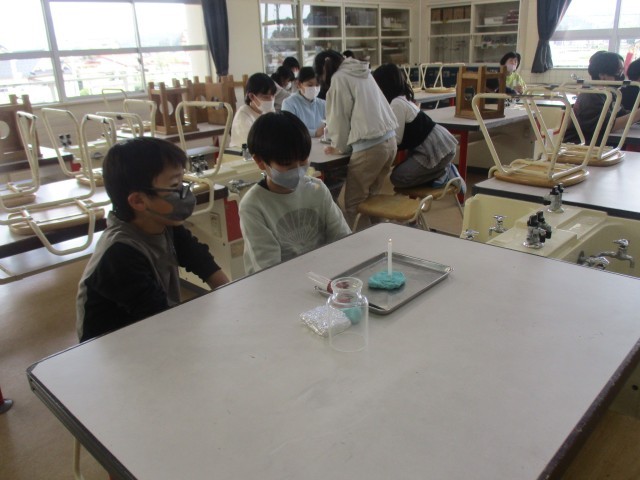 理科は、物の燃え方について学習しています。まずは、ろうそくの火が燃え続けるには、どうしたらよいかについて実験しました。安全に気を付け、条件を変えながら火がどうなるか見ています。