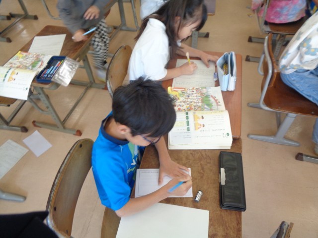 学習参観では、国語科「ともだちはどこかな」の学習をしました。手がかりになる情報を見つけて文章に書き表したり、友達にクイズを出したりして楽しみました。2年生になって頑張る姿を見ていただくことができました。