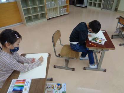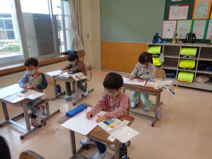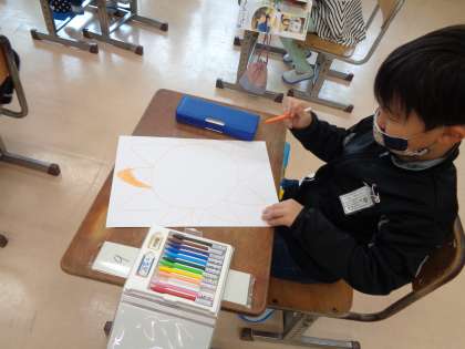 今日の図画工作の学習では、自分だけのおひさまをかきました。にこにこ笑顔なカラフルなおひさまがたくさんできあがりました。