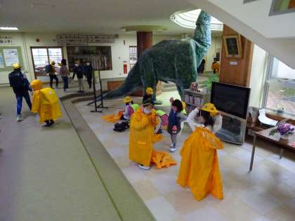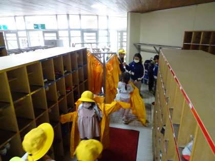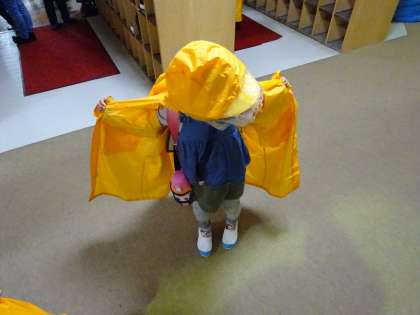 学校に到着すると、合羽を脱がなくてはいけません。悪戦苦闘しながらも、何とか脱いで、雨具かけにかけることができました。