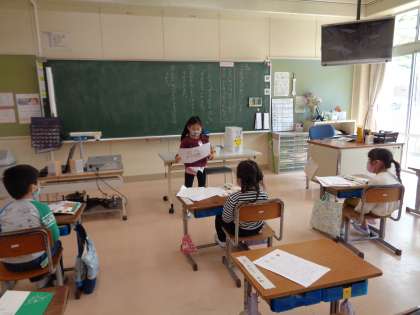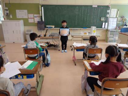 今日の国語の学習では、学校で見つけたものを絵に描いて発表しました。グループの友達に、見つけたものとそのときの気持ちを発表しました。最後は何人かが、みんなの前で発表し、全員真剣に話を聞いていました。