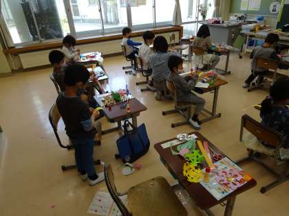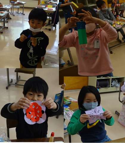 色とりどりの折り紙を、折ったり切ったり貼ったりして思い思いの飾りをつくりました。