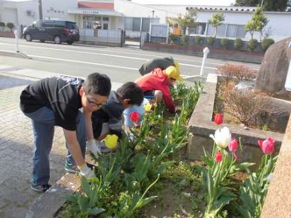 朝、学校花壇の除草に取り組んでいます。