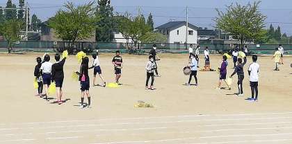 晴天の下、6年生が応援練習に取り組んでいます。どの団もエールや応援歌など、団らしさを大切にしています。