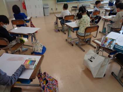今日の図画工作では、普段の生活のについて、みんなに見てほしいことを絵に表しました。新幹線に乗ったことや旅行に行ったこと、温泉に入ったことなどたくさんの思い出を上手に表していました。