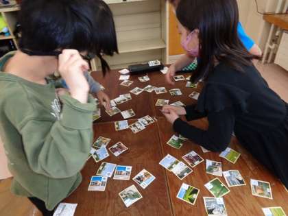 様々な種類の地図記号カードを使い、地図記号カルタを行いました。子どもたちはお題の地図記号を必死になって探し見つけ、楽しそうに取り組んでいました。