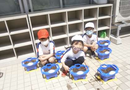 朝顔の種植えをしました。鉢に土と肥料を入れて混ぜ、指で開けた穴に種を入れました。