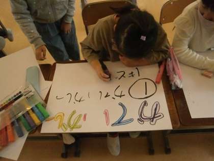 生活科の学習で、1年生に大庄小学校のことをより知ってもらうために、「学校紹介クイズ」を考えています。同じグループの友達と、どんなクイズにするか相談して活動している姿が見られました。