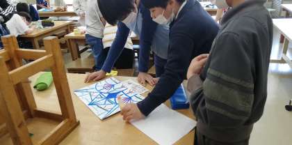 4年2組 図画工作 鑑賞 公開日 2021/05/11 更新日 2021/05/11 4年生 友達の作品から、感じたことやどんな技法を使ったかを自由に語りあっています。互いの感じ方の違いに学び合う場面でした。