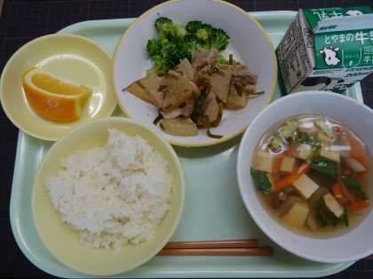 ごはん、牛乳、豚肉と昆布の甘辛煮