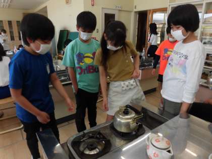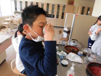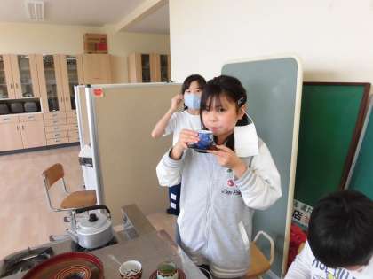 今日は、お茶を淹れる学習をしました。コンロでお湯を沸かし、一旦湯飲みにお湯を注ぎます。そのお湯をゆっくり急須に注ぎ、茶葉を蒸らして完成です。