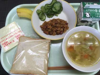 食パン、牛乳、チリコンカン、きゅうりもみ