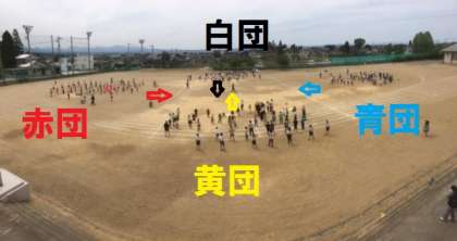 当日は、どの団も真ん中を向いて行います。(お互いの応援の様子をしっかり見ることができます。)