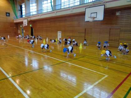 今日の体育では、わざセブンの動きに挑戦しました。今日は動物歩きと、おにごっこをしました。1回でもおにになってつかまえることができたら銅、一回もつかまらなかったら銀シールです。みんな一生懸命でした。また、動物歩きでは、10メートルほどを、うさぎ、わに、くも等、いろいろな歩き方で行いました。最後まで頑張っている子供に対し「がんばれ」と応援する姿に、心が温かくなりました。優しさいっぱいの1年生です。