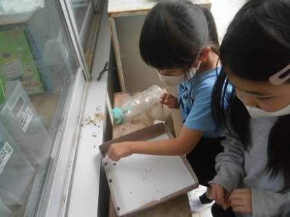 休み時間に子供たちの様子を見ていたら、生き物に興味をもち、進んでダンゴムシのお世話をしている姿が見られました。ダンゴムシが生活しやすいように、箱の中に土や葉っぱを入れていました。