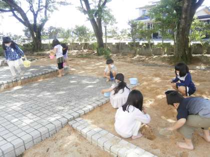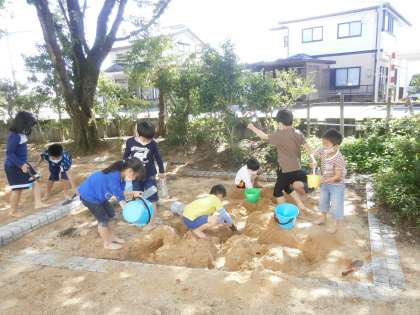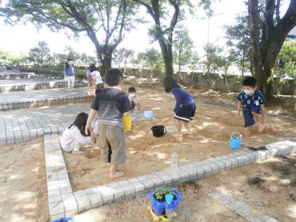 なかよしひろばの砂場で、バケツやペットボトルを使っていろいろなものを作っていました。