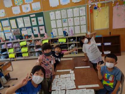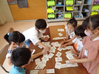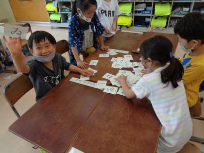 今日の国語では、あいうえおの学習をしました。あいうえおのうたを歌った後に、あいうえおを順番に並べました。友達と協力しながら一生懸命並べていました。一番は、5,6号車でした。