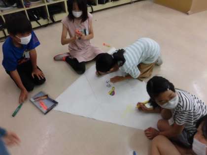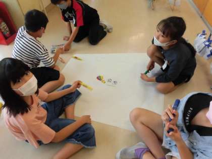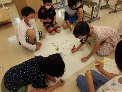 5年生は、宿泊学習に向けて、班ごとに意識したいことを話し合いました。学級目標の「にじいろ〜日進月歩 けじめ 一生懸命 朗然」を、宿泊学習でも達成できるようにするにはどうしたらよいか、一人一人の思いを書いていきました。