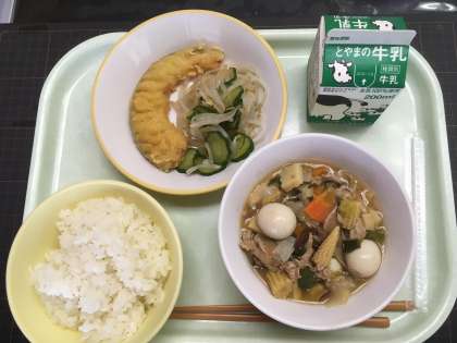 ごはん 牛乳 八宝菜 かぼちゃてんぷら,甘酢和え