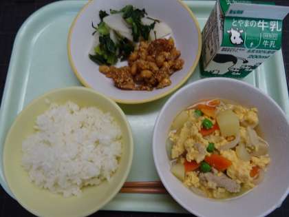 【献 立】 ごはん、牛乳、大豆とホタテのごまからめ、昆布和え、卵とじ