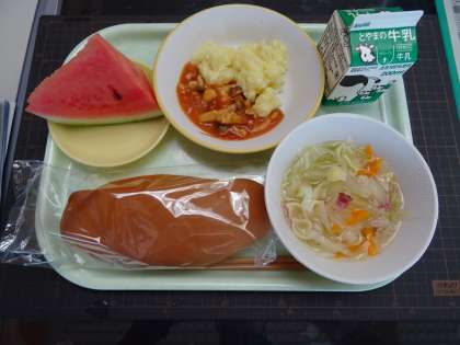 コッペパン、牛乳、鶏肉のトマト炒め、チーズポテト、マカロニスープ、スイカ