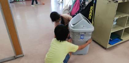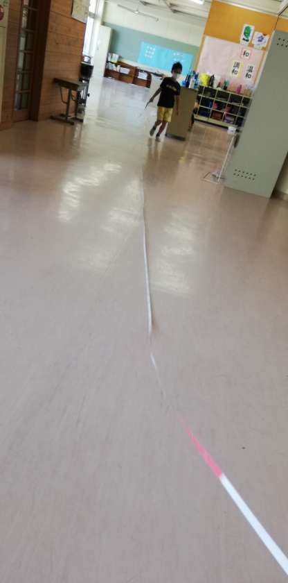 物差しでは測れない長い物や立体的な物を、グループで探しています。見当をつけて実測するので、長い長さの量感が身に付きます。ワークスペースの長さは?50メートル?100