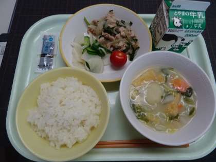 ごはん、牛乳、豚肉の塩麹炒め、かぶの色どり、