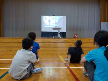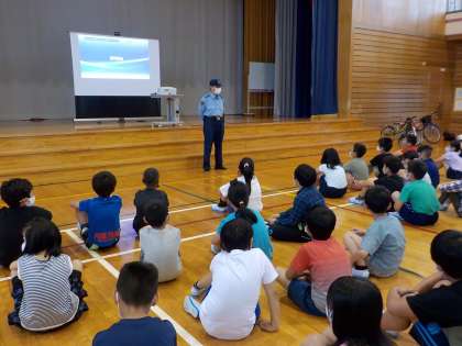 今日は、富山南警察署、大山交番の方をお招きし、自転車教室をしました。子供たちは、DVDで自転車の安全な乗り方を学んだり、教育車に乗って、道路を渡るときの安全確認の仕方をシミュレーションしたりしました。クイズにも挑戦し、学んだことを確認しました。