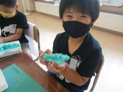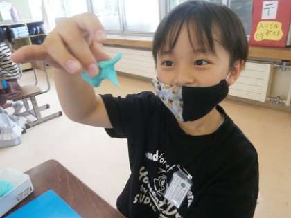 図画工作科「にぎにぎねん土」の学習を行いました。ねん土をにぎってできた形から、「わにみたいになった!」「食べ物みたい」と、想像を膨らませて活動に取り組む姿が見られました。
