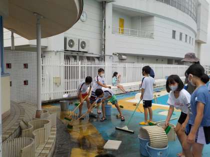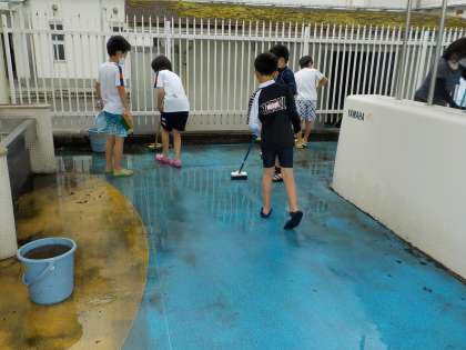 水を浴びながらも、一生懸命に掃除をしました。おかげで、プールもプールサイドもきれいになりました。